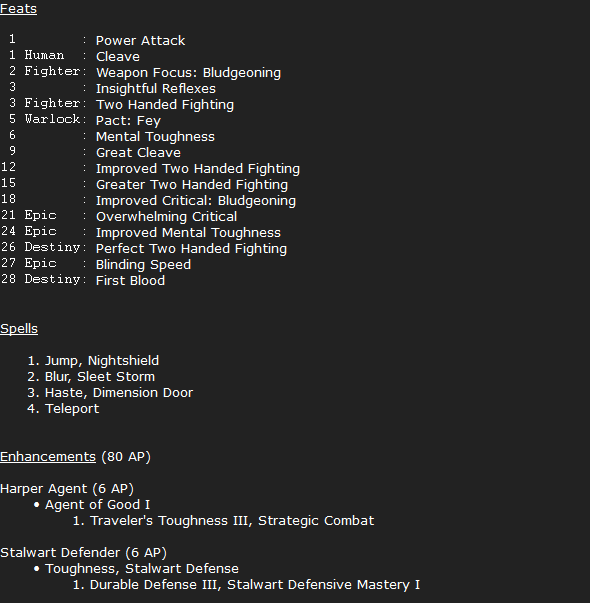The build is 3 rogue / 4 fighter / 13 bard. I went with a Shadar Kai race and focused on INT as my main stat, using the Harper tree enhancements to make this my damage stat. The build has proved to be really good. If you caught Samius’ Twitch stream last Friday you might have heard him mention the fact we were happy with our builds enough to run eE. We don’t normally bother. We’re more than happy to run eH so we can get through quests in a good time and not spend forever in an eE version of the quest. But this pairing has blitzed through eE quests without any real trouble. Yes there have been some deaths ( mainly me π ) but it’s never been a problem.