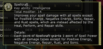 But as well as equipment I’ve been thinking about stats and skills. Othala is Fey Pact and I have taken the Utterdark Blast enhancement. This means my eldritch blast damage is evil & sonic. Obviously I want to enhance the spellpower for those areas as much as possible and last night I got confused about whether the Spellcraft skill was, in fact, of any use. It specifically says it does not help sonic and for some reason I confused the positive spellpower with light, thinking it also wouldn’t help with the evil damage.