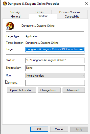 The properties window for the DDO Launcher