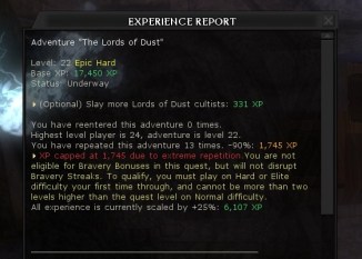 On Sunday night our guild decided to try eH Offering of Blood, something we’ve not tried running on epic before. There were only 4 (out of the 5) of us. It was going fairly well. There was a slight hiccup to procedures when we got to the second bridge, where the traps are, and realised the rock ledges around the side of the cave were no longer there 🙂 but we got past. Unfortunately, we completely wiped when we got to the last fight. The scorpions just stunned us over & over…. oh well. We have some ideas of what to do on our next attempt. And I definitely want to try it again, it’s something different, I’ve realised my monk is not flagged for ADQ (no idea how that happened!) and it was 45K XP!